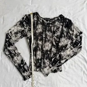 Sheer printed mesh long-sleeve top. Fitted silhouette with a slightly cropped hem. Bold black and white abstract pattern. Stretchy, lightweight fabric for layering.