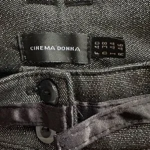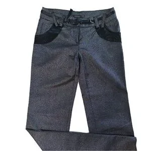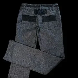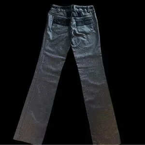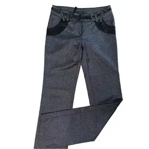 Super unique early-2000s metallic trousers with a subtle silver shimmer woven throughout. These pants have a structured yet slightly stretchy fit and feature incredible design detailing that makes them truly standout. The metallic weave catches the light beautifully — the dimension and shimmer are even more striking in person.