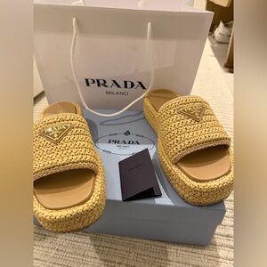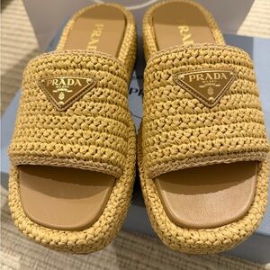 Prada Beige Raffia Platform Slide Sandals