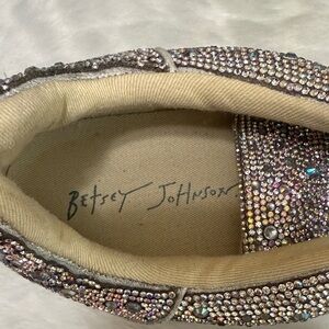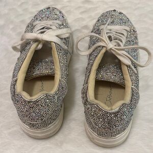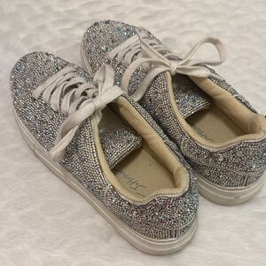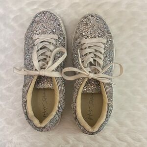 Low-top Betsey Johnson sneakers with full crystal embellishment. Sparkling silver crystals cover the upper for dazzling shine. Lace-up style for a secure fit. Casual yet glamorous look for day or night.