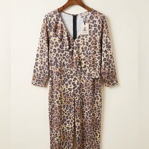 Leopard-print jumpsuit with faux-wrap ruffle front. V-neckline and three-quarter sleeves. Tailored waist with back zipper closure. Bold neutral pattern for statement styling.