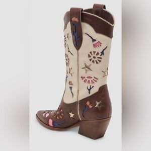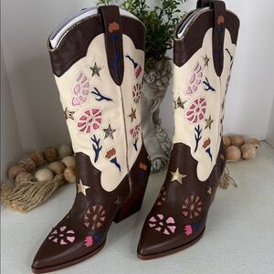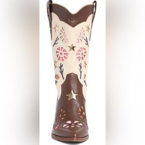 Step out in style with these chic brown and cream embroidered western boots. Perfect for adding a touch of flair to any outfit. Floral cutouts sweeten a colorblock Western boot fashioned with a pointed toe and angled block heel for chic style.
