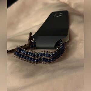 Three-row navy beaded wrap bracelet with dark cord. Silver-tone wire accents between beads. Casual, stackable style. Adjustable tie closure.