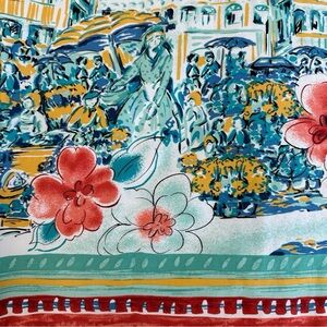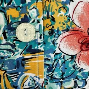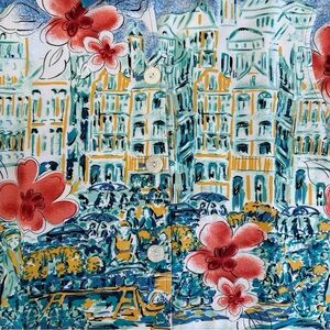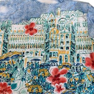 Beautiful colorful shirt / overshirt featuring an illustrated European cityscape with bold floral accents, giving major Italian summer / Amalfi coast / vacation in Europe vibe. Thicker structured fabric makes it perfect worn open as a lightweight jacket or buttoned as a statement top.