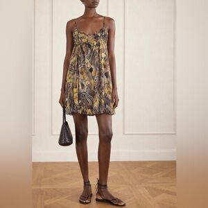 Marciano by Guess yellow and taupe abstract print silk mini sundress with a bubble hem and spaghetti straps.
