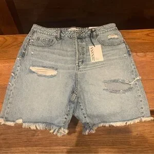 Casual light blue denim shorts from Zenana Outfitters. Distressed details and frayed hem. Button fly with classic five-pocket styling. Relaxed, easy-to-wear cut for everyday outfits. I