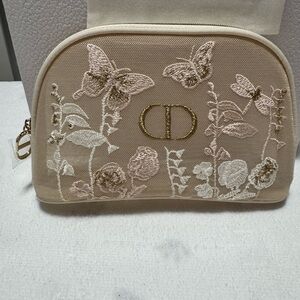 Dior Beige Embroidered Floral & Butterfly Cosmetic Pouch with Gold CD Logo