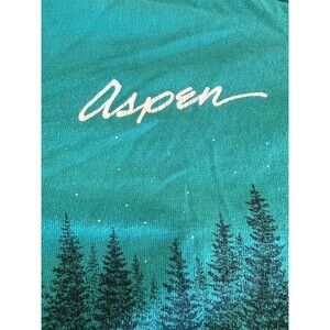 Teal/turquoise body with contrasting black lining on collar and sleeves. Front features a stunning wrap-around all over graphic of a wolf pack gathered in a moonlit, snow-covered landscape with a dense pine forest and full moon backdrop. Script Aspen lettering in white on the chest. Graphic is on front and back of shirt.