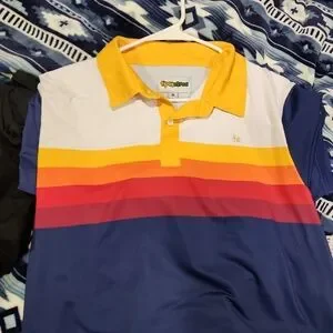 Bright yellow, red, and orange stripes across the top. Tipsy Elves brand. Lightly used.