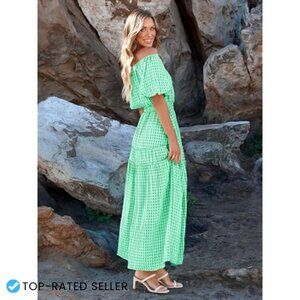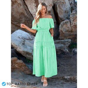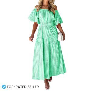 Off Shoulder Smocked Maxi Dress Flowy Boho Summer Casual Puff Sleeve