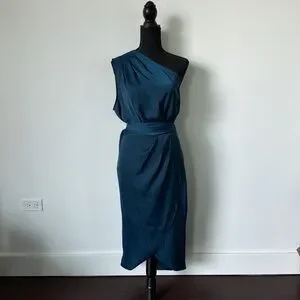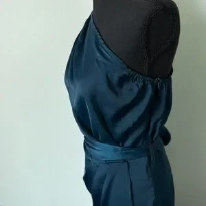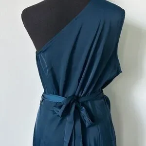 Elegant one-shoulder teal blue dress with a draped bodice and wrap-style skirt. Soft satin fabric creates a smooth, polished finish. Designed for easy styling for evening and special events.