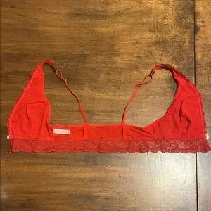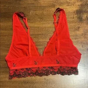 Chic semi-sheer red bralette with elegant black lace overlay. Offers comfort and style. Ideal for a sophisticated look.