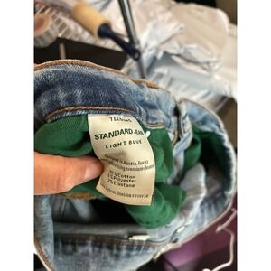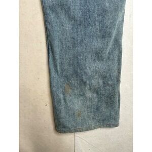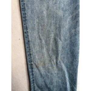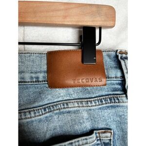 Tecovas Standard Jean in Light Blue wash offers a timeless look with a comfortable stretch blend. These straight-leg jeans are handcrafted from premium denim and feature a classic five-pocket design, branded leather back patch, and signature hardware. The light wash provides a versatile, broken-in aesthetic suitable for everyday wear. Please note there are some visible stains/discoloration on the front legs as shown in the photos.