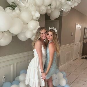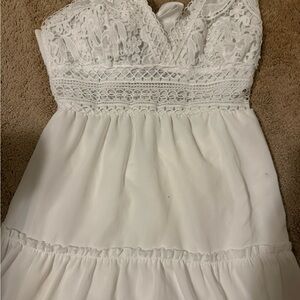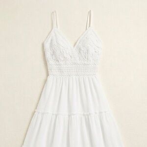 Elegant white maxi dress with a lace bodice and tiered skirt. Features delicate spaghetti straps and a flattering V-neck. Lightweight and breathable for warm-weather wear. Perfect for daytime events and casual outings in white.