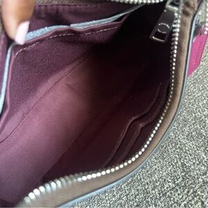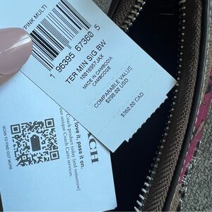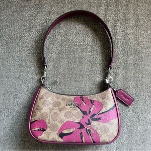 Coach shoulder bag in signature coated canvas. Bold pink floral print overlays the brown monogram. Top zip closure and single leather shoulder strap. Silver-tone hardware and Coach hangtag detail. ACoach Teri Mini Shoulder Bag Signature Canvas Pink Multi Bow Print Crossbody Purse NWT