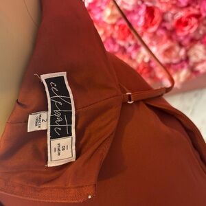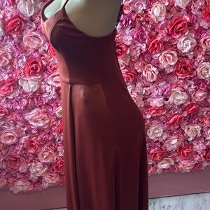This bold, rust-colored slip dress commands attention with its sleek silhouette and delicate spaghetti straps. Crafted for those who dare to embrace simplicity with a fierce edge, this dress flows gracefully to a midi length, perfect for making a statement at any event.