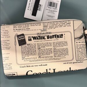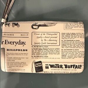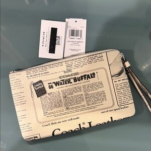 Coach leather wristlet with newspaper-inspired print. Cream background with black text and graphic panels. Top zip closure with wrist strap. Compact and graphic accessory for everyday use.