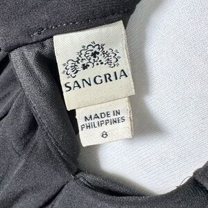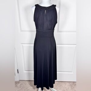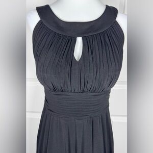 Sangria black sleeveless dress in women’s size 8 with a flattering fit-and-flare silhouette, pleated bodice, keyhole neckline, ruched waistband, and flowy high-low hem. Timeless and elegant for wedding guest, cocktail party, holiday, evening, date night, or semi-formal occasions.
