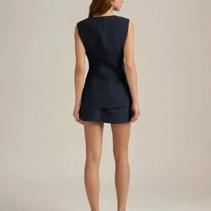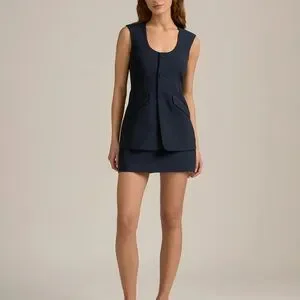 Sleek sleeveless vest-style top in deep navy. Features a scoop neckline, three front buttons, and subtle flap pockets. Clean lines and a tailored silhouette. Versatile for day or evening.