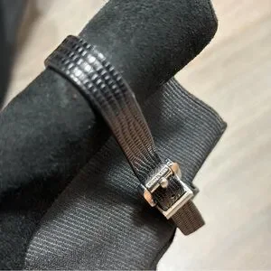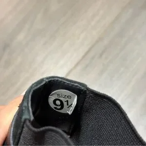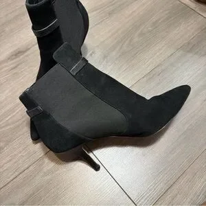 Sleek black suede ankle boot. Pointed toe and slim stiletto heel. Elastic side panels for easy slip-on wear. Decorative buckle strap adds chic detail. Classic black silhouette for versatile styling.