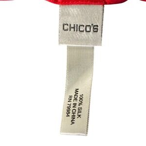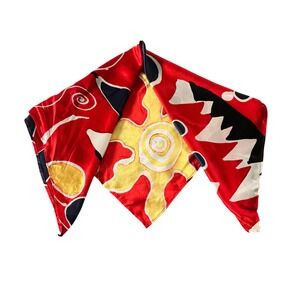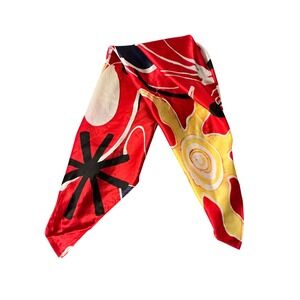 Chico's square silk scarf features a vibrant abstract print with celestial sun and geometric motifs in a bold palette of red, yellow, black, and white. Crafted from 100% silk, this lightweight accessory offers a smooth, lustrous finish and versatile styling options for the neck, hair, or handbag. The artistic design combines whimsical swirls and sharp graphic elements for a modern, eye-catching look.