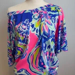 Keywords: Lilly Pulitzer, Preppy, Coastal, Tropical, Resortwear, Bright, Neon, Shell Print, Boat Neck, Rayon Spandex, Summer Dress, Vacation, Beach, Palm Beach, Colorful