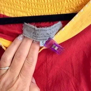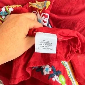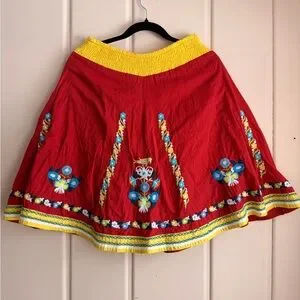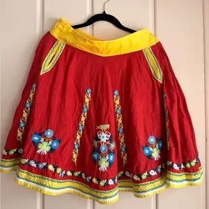 This vibrant red skirt features intricate embroidery and a striking yellow waistband. Perfect for adding a pop of color to your wardrobe.