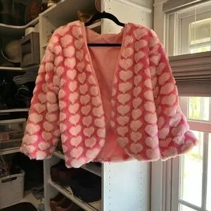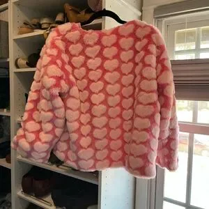 Soft pink faux fur jacket with white heart pattern. Plush, lined design for cozy warmth. Stylish open-front silhouette perfect for layering. Eye-catching pink tones colorway adds playful charm to any outfit. 7/8 sleeve.