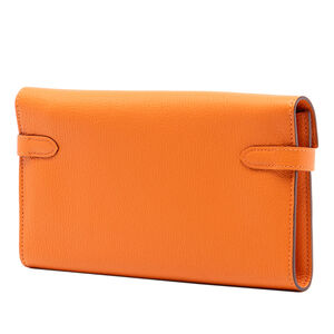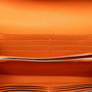 This long wallet features a goatskin leather body in Orange color, a front flap with turn lock closure, and interior zip and slip pockets. It carries an AB condition rating.