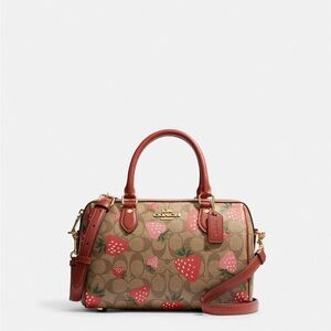 Coach satchel in signature brown canvas with playful red strawberry motif. Red leather handles and trim accent the design. Gold-tone hardware and front zip pocket for quick access. Cute and versatile everyday carry. Included in set matching snap wallet and wristlet. Used a few times