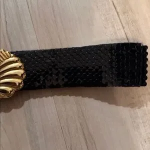 Vintage black fish scaled stretch belt with an eye-catching gold swirl buckle, Size Xsmall/ Small. In great vintage condition, minor wear, more fabulous in person! Adds polished detail to dresses and high-waist styles. Comfortable elastic construction for a sleek, adjustable fit. Perfect for elevating casual or dressy looks in black and gold. OFFERS ARE WELCOME!