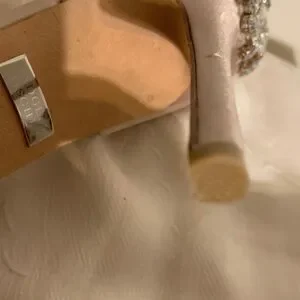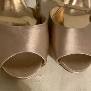 Sparkling crystal embellishments cover the heel counters. Sleek champagne satin finish on the heels. Secure ankle strap for a refined fit. Glamorous choice for formal events.