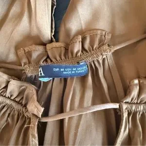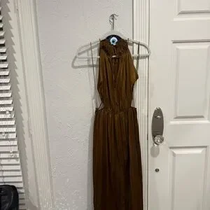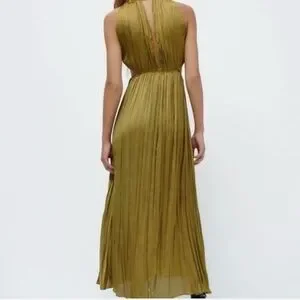 Silky satin maxi dress by Zara. Halter neckline with tie details. Front cutout and gathered waist. Flowy A-line skirt. Elegant evening-ready silhouette.