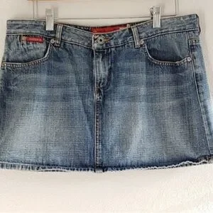 Classic Guess 1981 denim mini skirt with that perfect lived-in wash and flattering fit. Features a mid-rise style, classic 5-pocket design, belt loops, and subtle distressing for an effortless Y2K / vintage-inspired look. Easy to dress up or down—pair with a tee, crop top, or oversized sweater.