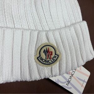 New Moncler women’s ribbed knit beanie in classic white with Pom-pom