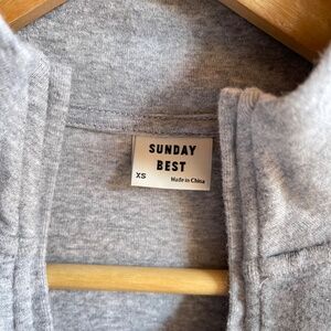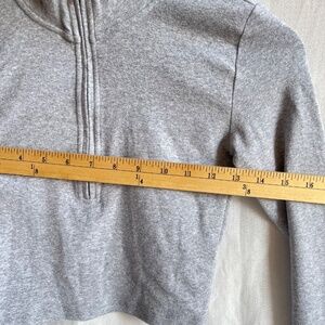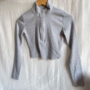Soft heather gray crop top with long sleeves. Features a half-zip front and mock collar. Lightweight and versatile for layering.