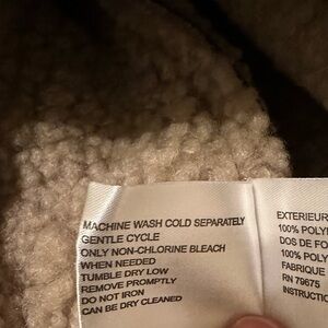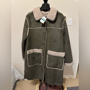 New with original tag. Soft, warm, medium-weight coat with plush faux shearling texture. Classic straight silhouette, comfortable fit, and practical length suitable for fall and winter wear. Fully lined. Button front closure with functional front pockets.