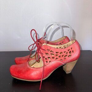 Fidji Red Leather Lace Up Heels Laser Cut Geometric Cutout Retro Art to Wear 37 6.5-7