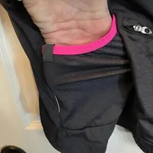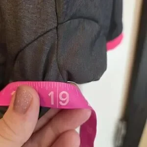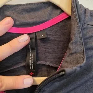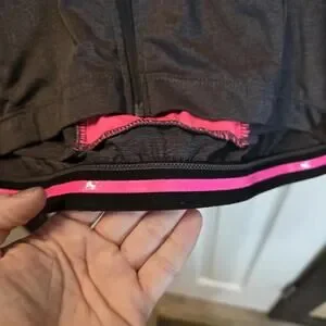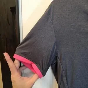 Women's short sleeve cycling jersey in dark gray with bright pink trim. Features a full front zipper for ventilation and easy on/off. Made from lightweight, breathable fabric designed for comfort during rides. Size Medium. Excellent condition with minimal signs of wear.