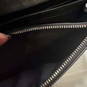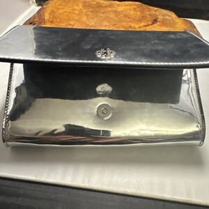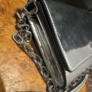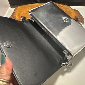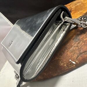 Sleek Tory Burch clutch in shiny metallic silver. Chain strap for versatile carry. Polished exterior with signature logo detail. Modern and eye-catching accessory. It measures 7.75”x5”x1.5” inches. Strap drop of 22” inches. Please view all the pics and message if there is any concerns. This bag never been used.