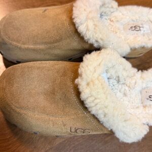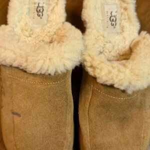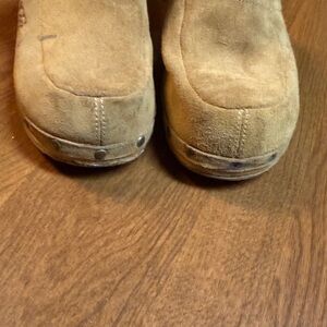 Vintage Ugg Shearling Tan Clogs w/ wooden bottoms size 7/38. New soles on shoes, upper in fair condition, lots of life still in them. Please look at all photos, left shoe missing some nail heads.