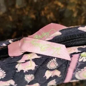 Quilted Vera Bradley cosmetic case with paisley and elephant print. Navy background with pink and light green accents. Top zipper closure and wristlet strap. Lightweight and soft fabric construction. Cute and playful pattern for travel or everyday use. (some minor spots on lining)