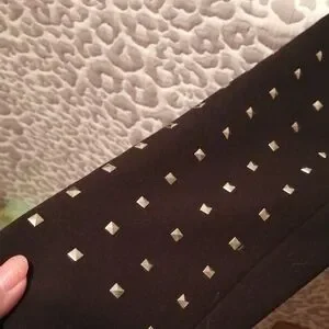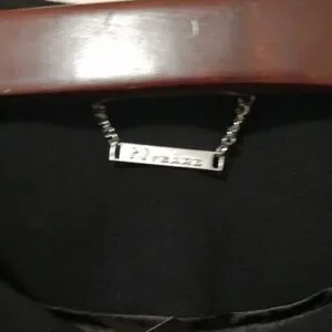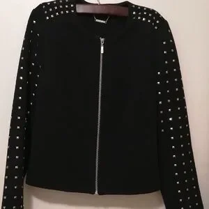 Sleek black jacket with silver-tone stud accents on shoulders and sleeves. Front silver zipper closure. Minimal, modern silhouette for versatile styling. Pre loved, good for out or work timeless style. Made of 68% polyester, 29%rayon, 3%spandex, measurements: neck to bottom 22" ling, pit to pit 19", stretching till 20", sleeve length pit to wrist 18.5",