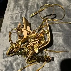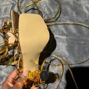 Glittering gold high-heel sandals with butterfly accents. Strappy lace-up design for a customizable fit. Metallic gold finish adds standout sparkle for evening wear.