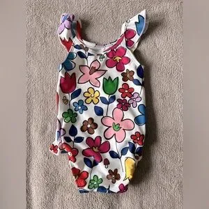 Adorable Hanna Andersson girls one piece swimsuit with colorful floral print. Made with the brand’s signature quality and comfort for playtime at the pool or beach.