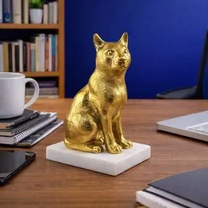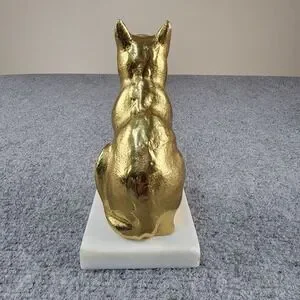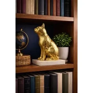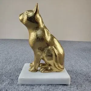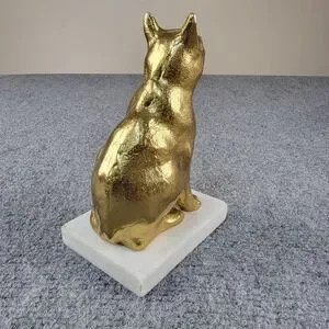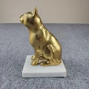 This vintage cast metal cat features a textured, polished, & gold-finished surface that captures light beautifully. Mounted on a solid white marble rectangular base, this elegant feline statue adds a touch of sophisticated charm to any bookshelf, desk, or mantel. The cat is depicted in a seated, attentive pose with its head slightly tilted upward, showcasing fine detailing in the ears and paws. The combination of the warm gold tones and the cool, natural marble makes it a versatile decorative piece for modern, eclectic, or traditional interiors.