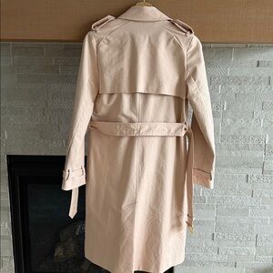 Classic double-breasted trench silhouette. Belted waist with buckle closure. Epaulettes and cuff straps for detail. Gold-tone buttons and hardware. Smooth, tailored finish for a polished look. Color is slightly pink but still light and neutral-looking