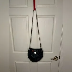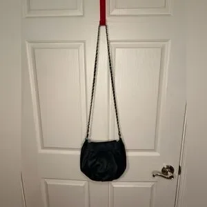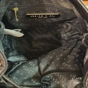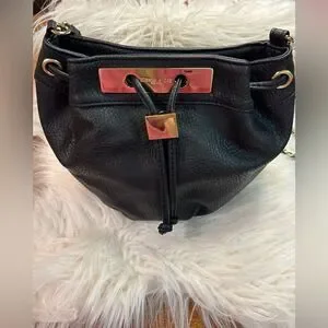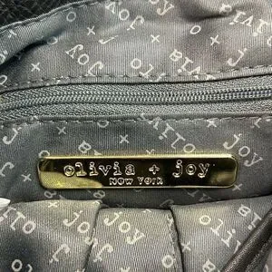 Olivia + Joy faux leather mini bucket purse, one large compartment, one zip and two small pouch pockets inside NOTE: minor scratches on front plaque and pull, please refer to last picture