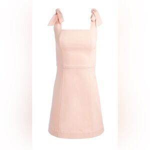 Fitted mini dress with a square neckline. Sleeveless design with vertical seam accents. Soft blush pink hue for a feminine look. Clean silhouette suitable for day or night.