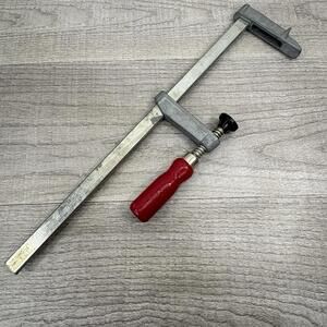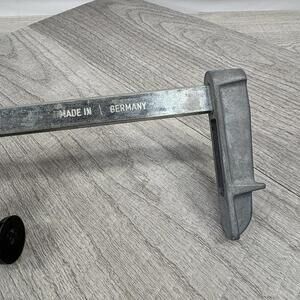 this cool vintage sliding bar clamp, stamped “MADE IN GERMANY” on the bar. Classic old-school design with fixed L-shaped head, sliding jaw, and red wooden handle for tightening the screw. The black knob has some wear but grips well.